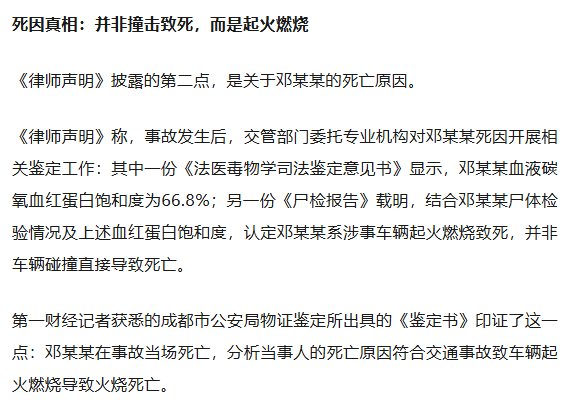 近日,受在事故中可怜身一火的车主邓某某家属请托,四川亚峰讼师事务所出具了一份《讼师声明》。该声明闪现了“10·13成皆小米SU7自燃事故”中对于交通事故职守认定、车主牺牲原因、车门无法开启这三大公众眷注焦点的更多细节。