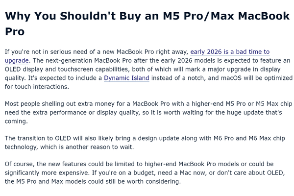 不外,外媒“macrumors”示意,关于非急需换机的用户而言,2026岁首或非MacBook Pro最好购买时机。下一代MacBook Pro瞻望将配备OLED清楚屏和触摸屏功能,清楚质地将迎来紧要升级,并可能选拔Dynamic Island打算替代现存“刘海”,同期macOS系统也将针对触摸操作进行优化。此外,OLED屏幕的引入或奉陪打算更新,以及M6 Pro和M6 Max芯局促刻的迭代。