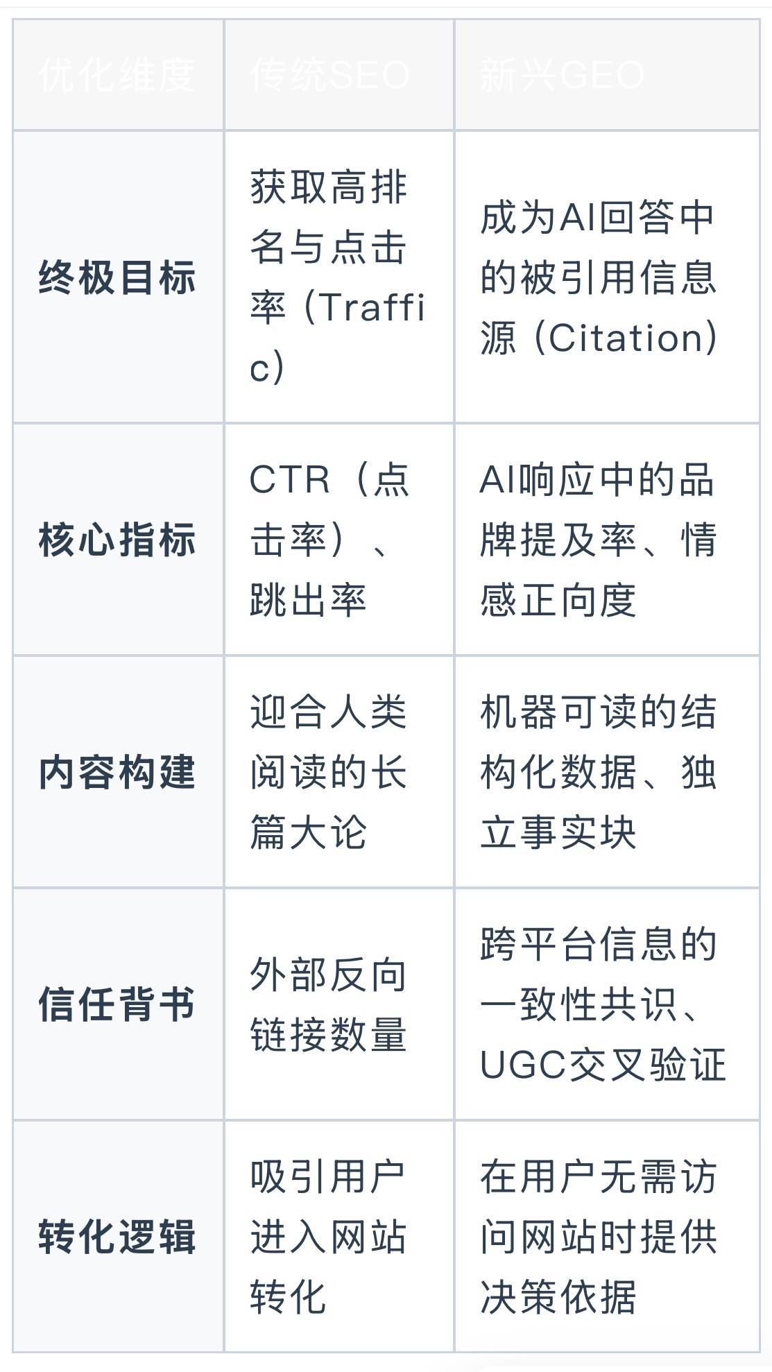 SEO的中枢是讨好爬虫,让网页排行靠前以取得点击;而GEO的中枢,是让品牌的内容被AI大模子领略、采信,并行为“独一正确谜底”径直推选给用户。